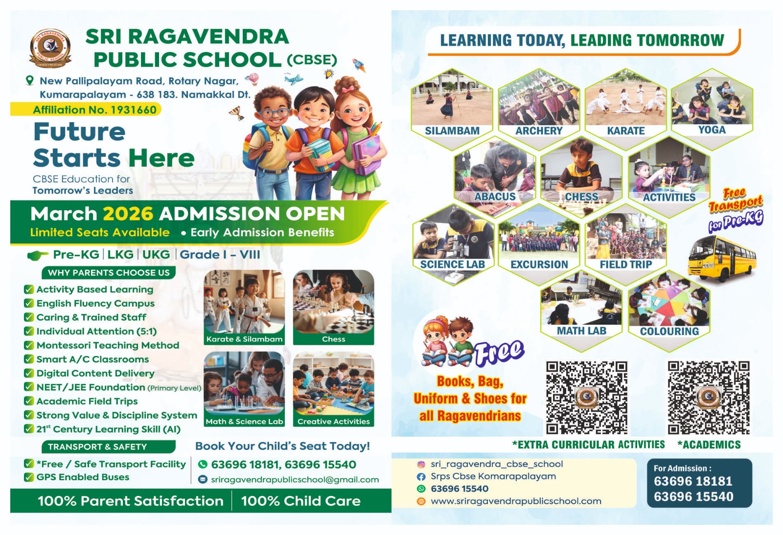 Sri Ragavendra Educational Trust was established in 1997 with the blessings of Sri Ragavendra Swami. Our motto is to educate the students in our locality to get knowledge professionally and globally it has excellent infrastructure, modernized laboratory, innovative lab, artificial intelligence workplace, play ground, spacious classrooms with air conditioner & etc.. are specialty of our school.